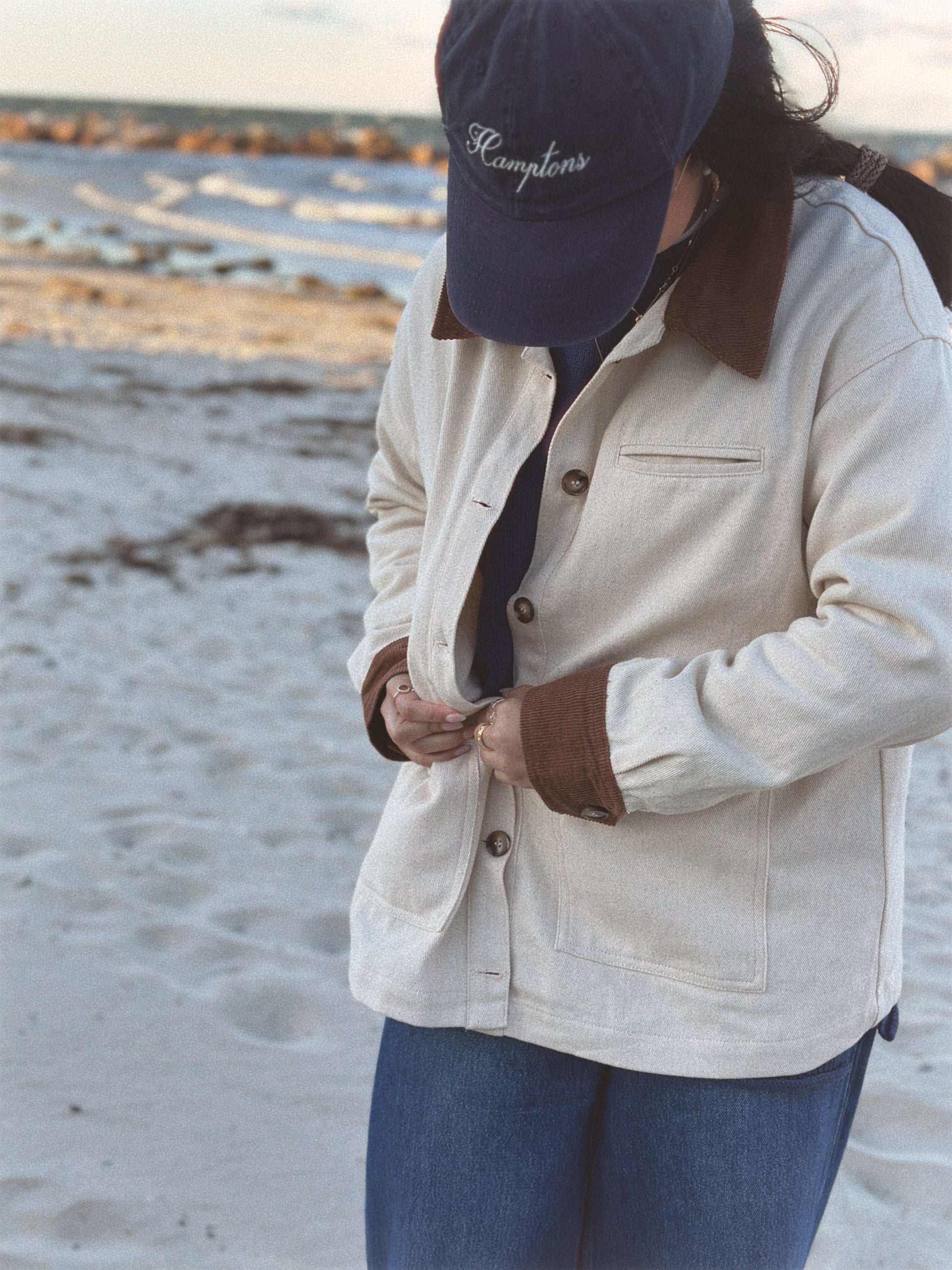 The Myra Barn Jacket is everything you could ever want in a fall layer. Contrast corduroy collar and cuffs, 100% cotton, and the perfect boxy fit. It’s timeless and made for effortless layering. Coming in a warm cream with deep brown accents, you'll reach for it every day.