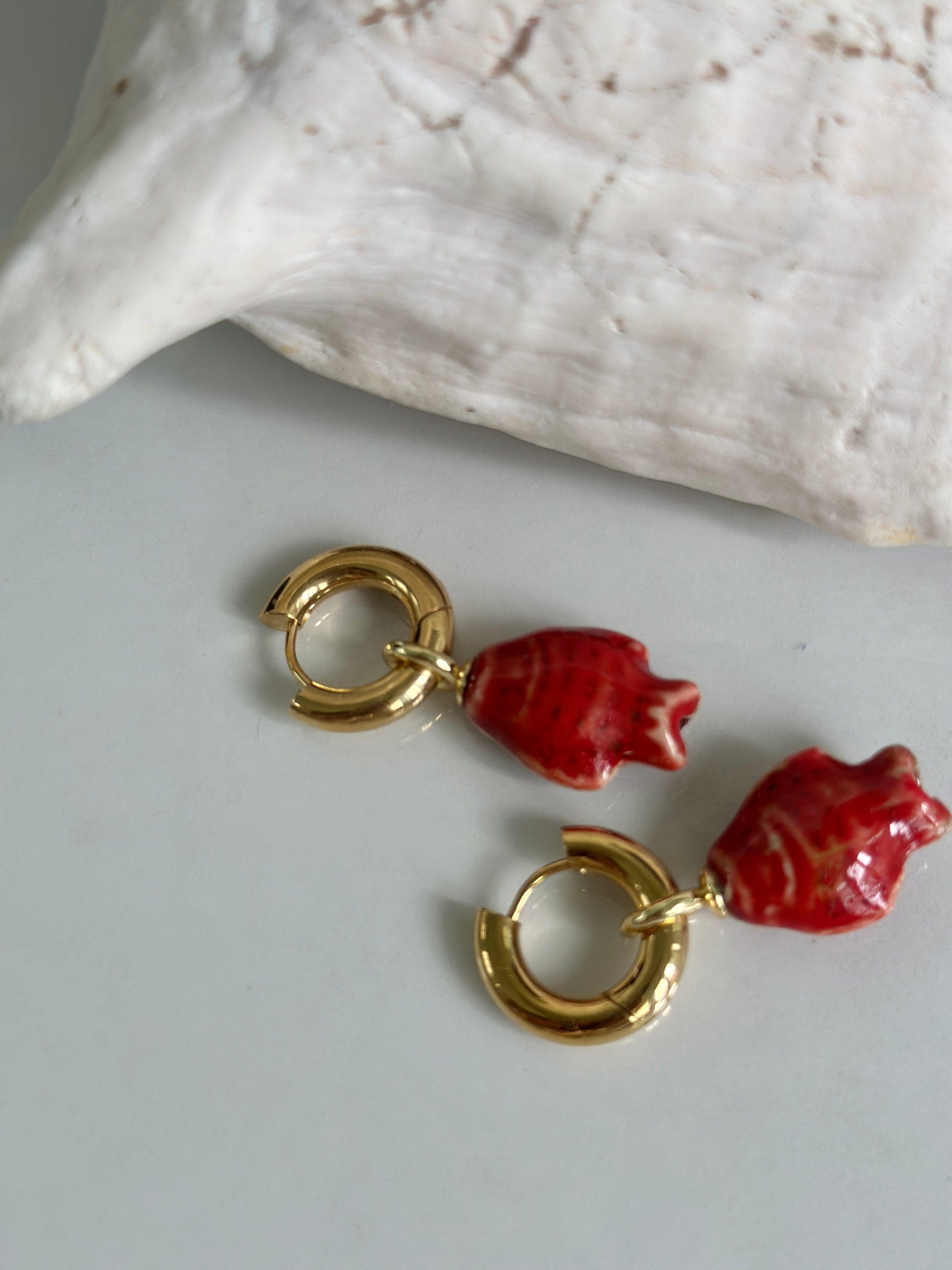 The Harbor Red Hoops feature glossy red ceramic fish charms that sway from classic gold hoops, a playful nod to seaside life and slow summer days.