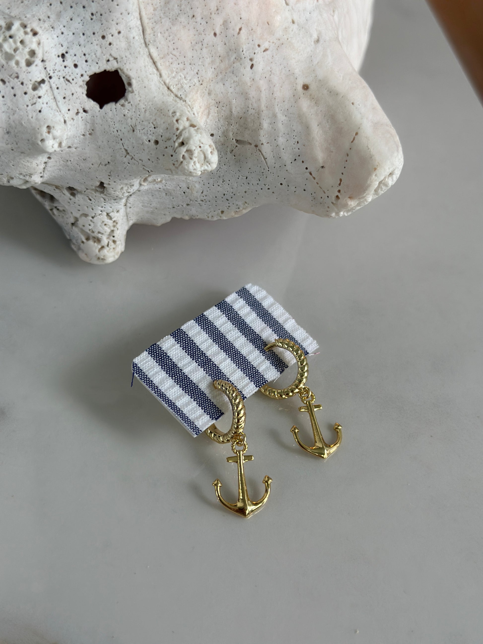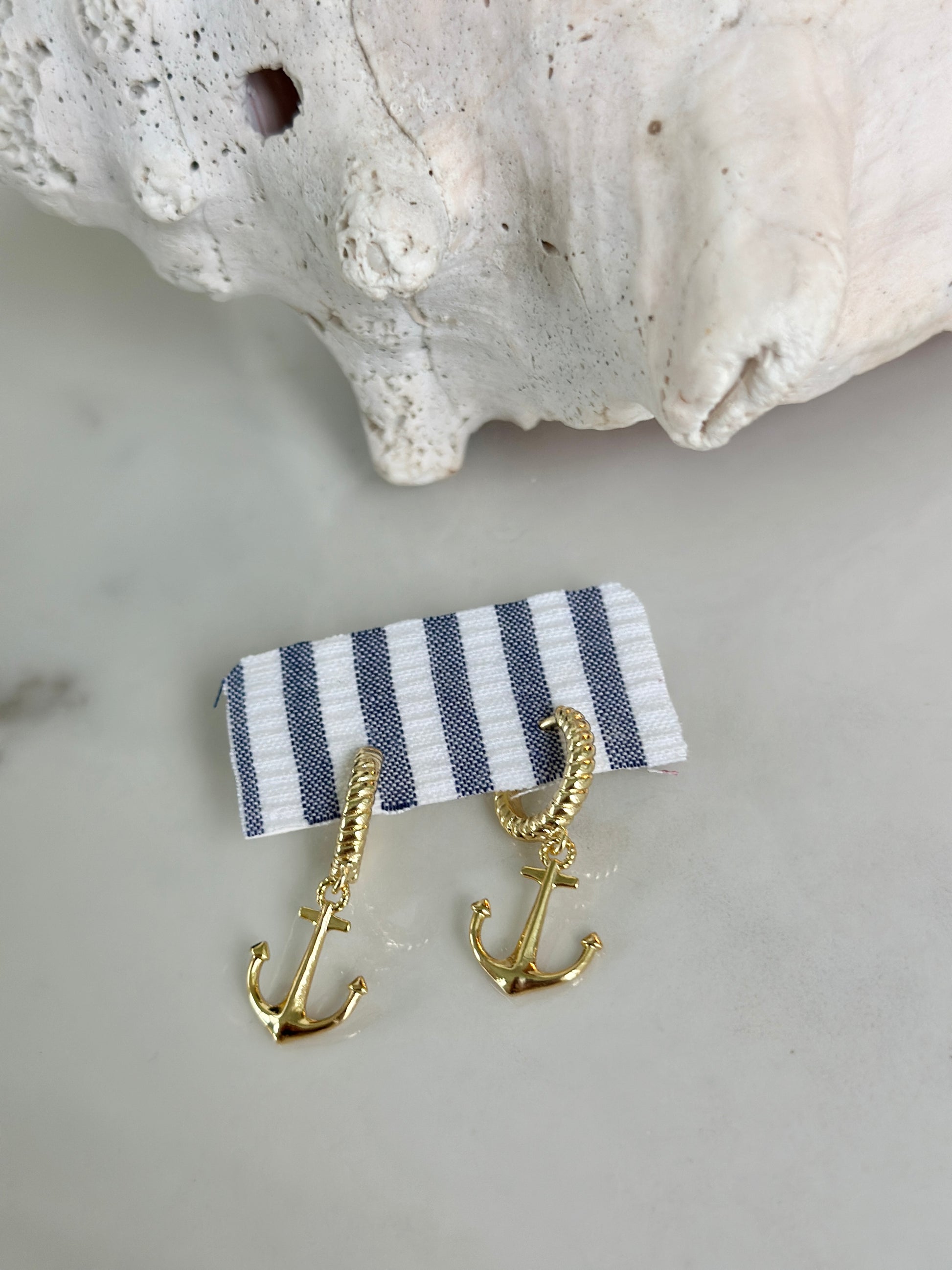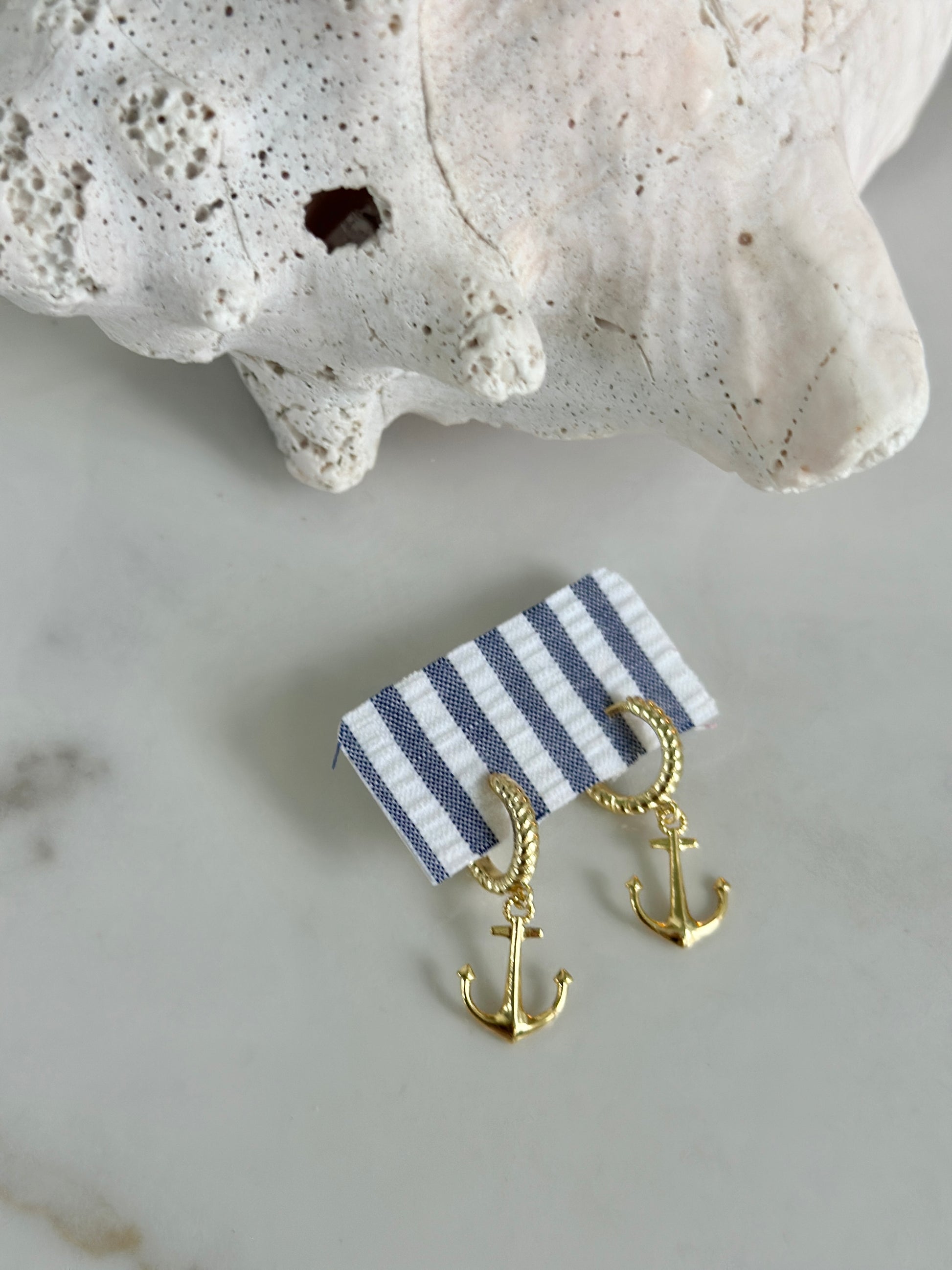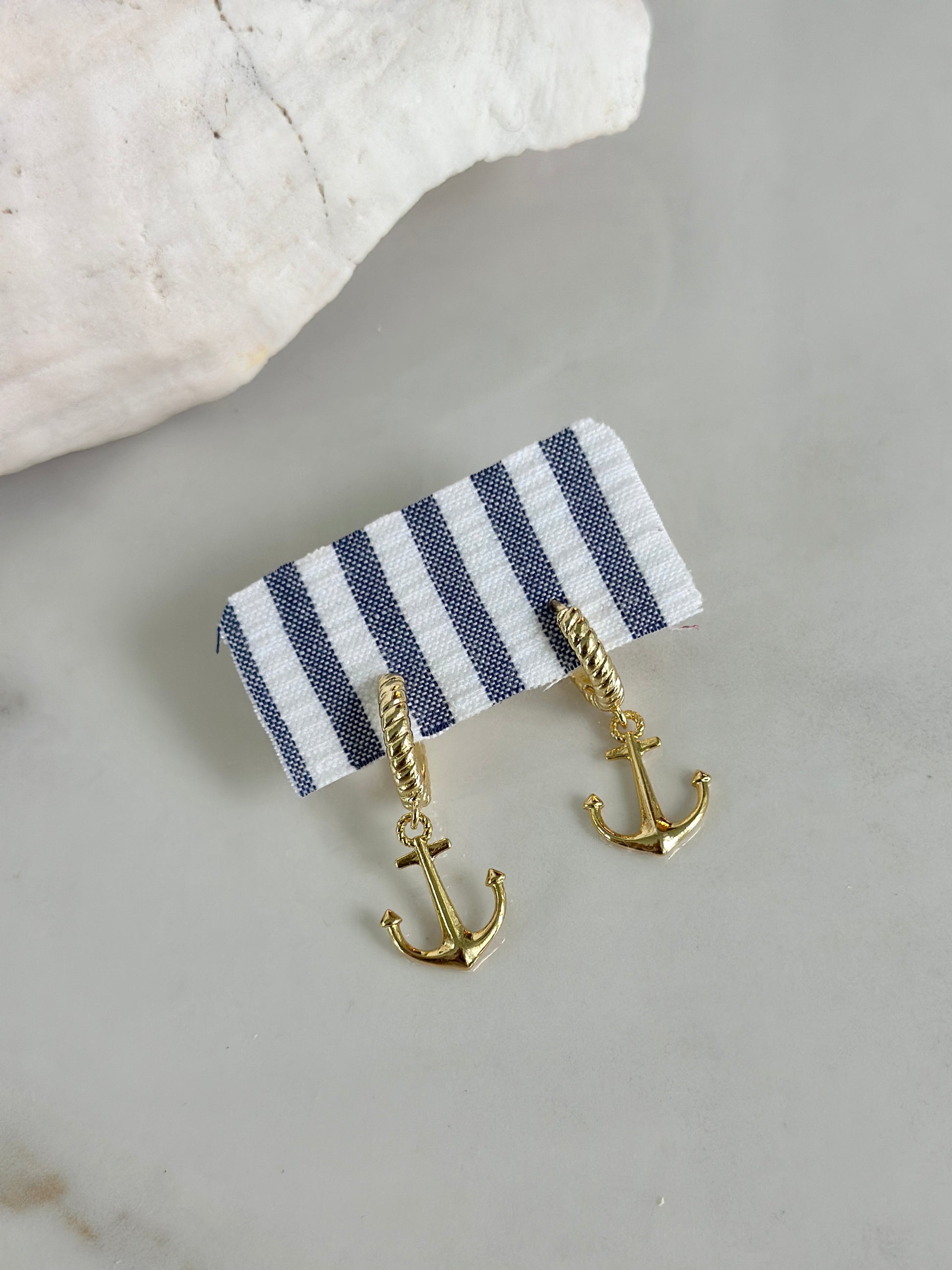 The Portside Anchor Hoops are a golden nod to easy, coastal days. Each textured hoop holds a polished anchor charm — a timeless symbol of strength and calm. Lightweight and about an inch long, these earrings bring just the right touch of nautical charm to your everyday look.
