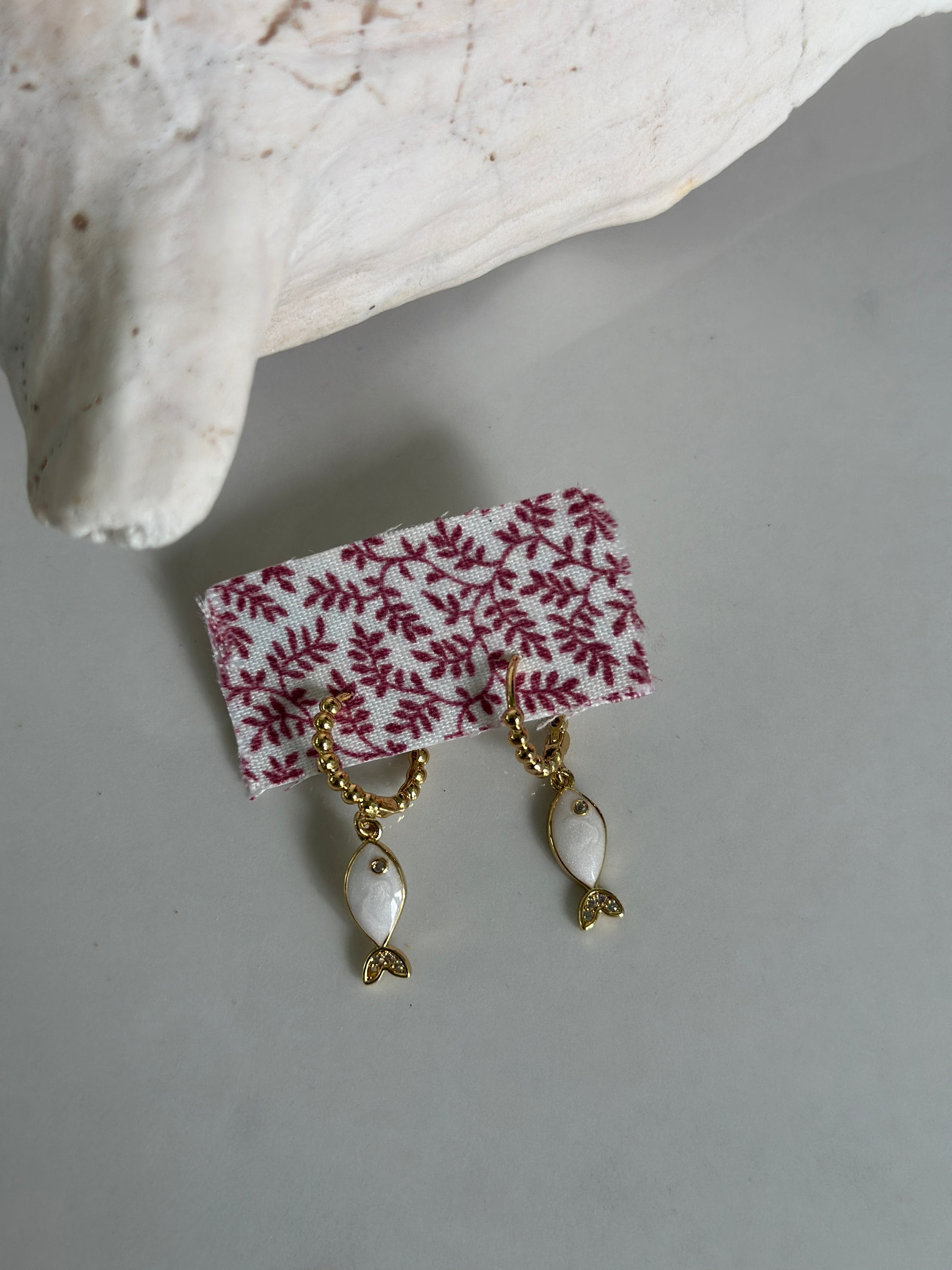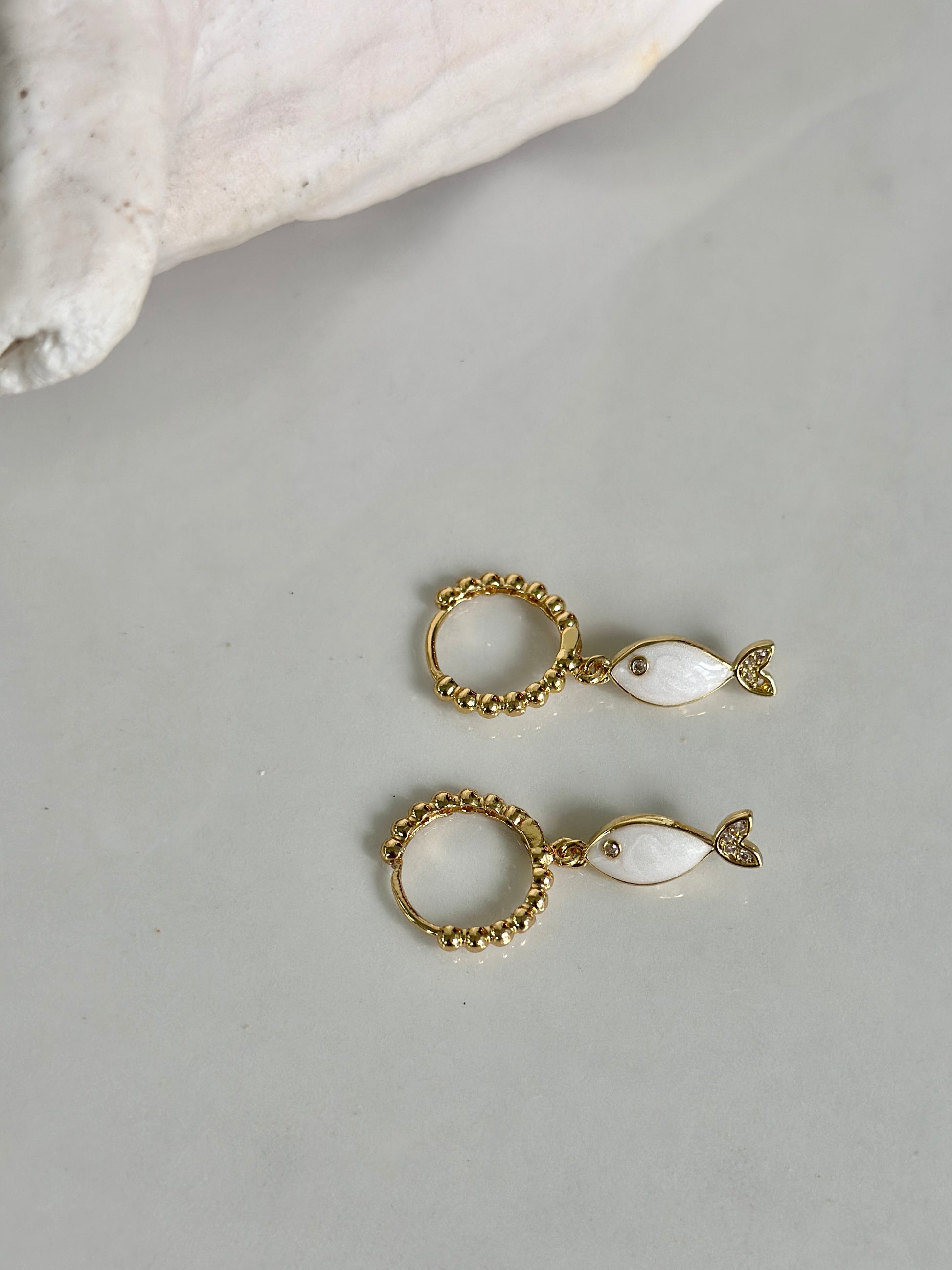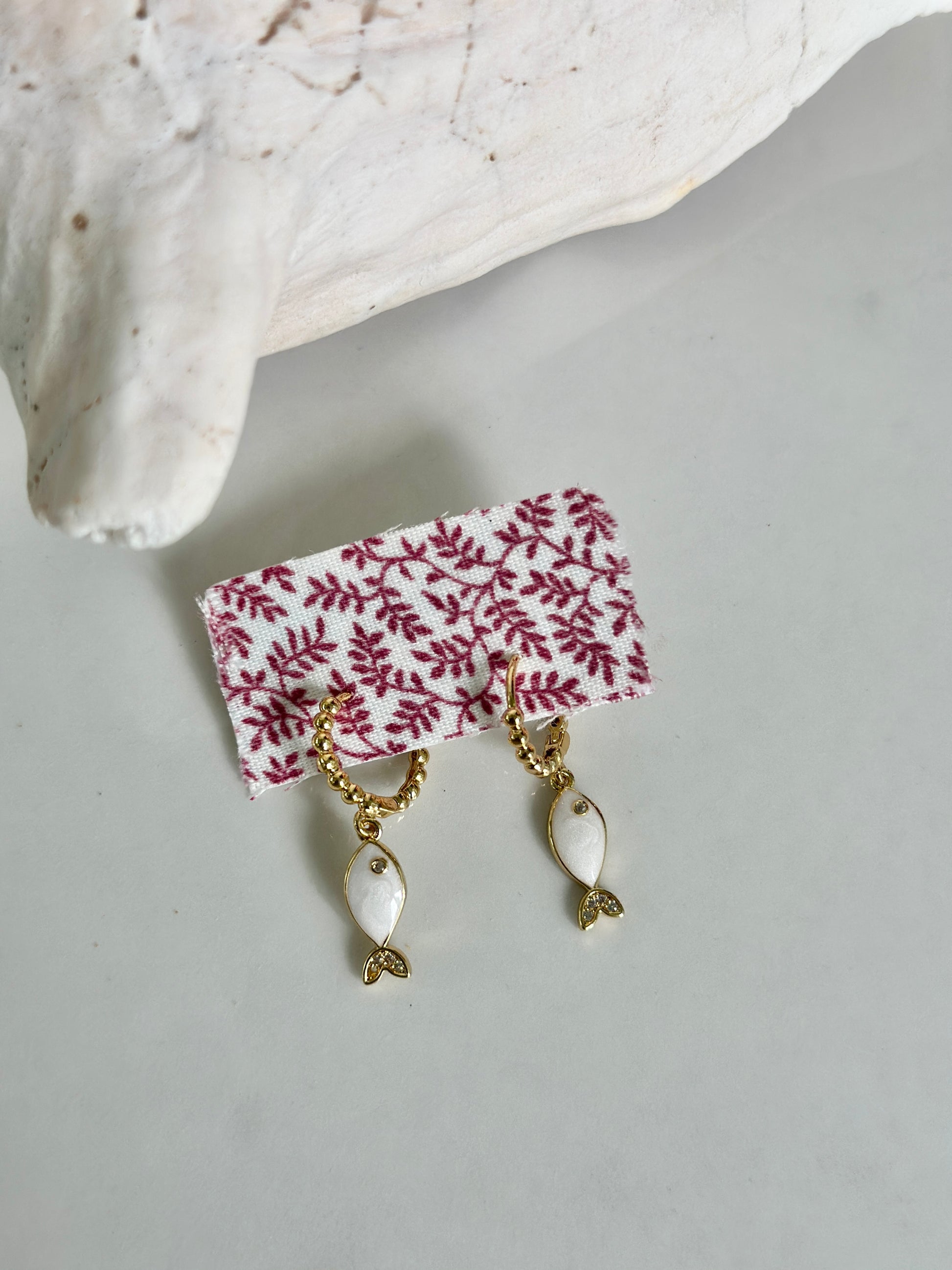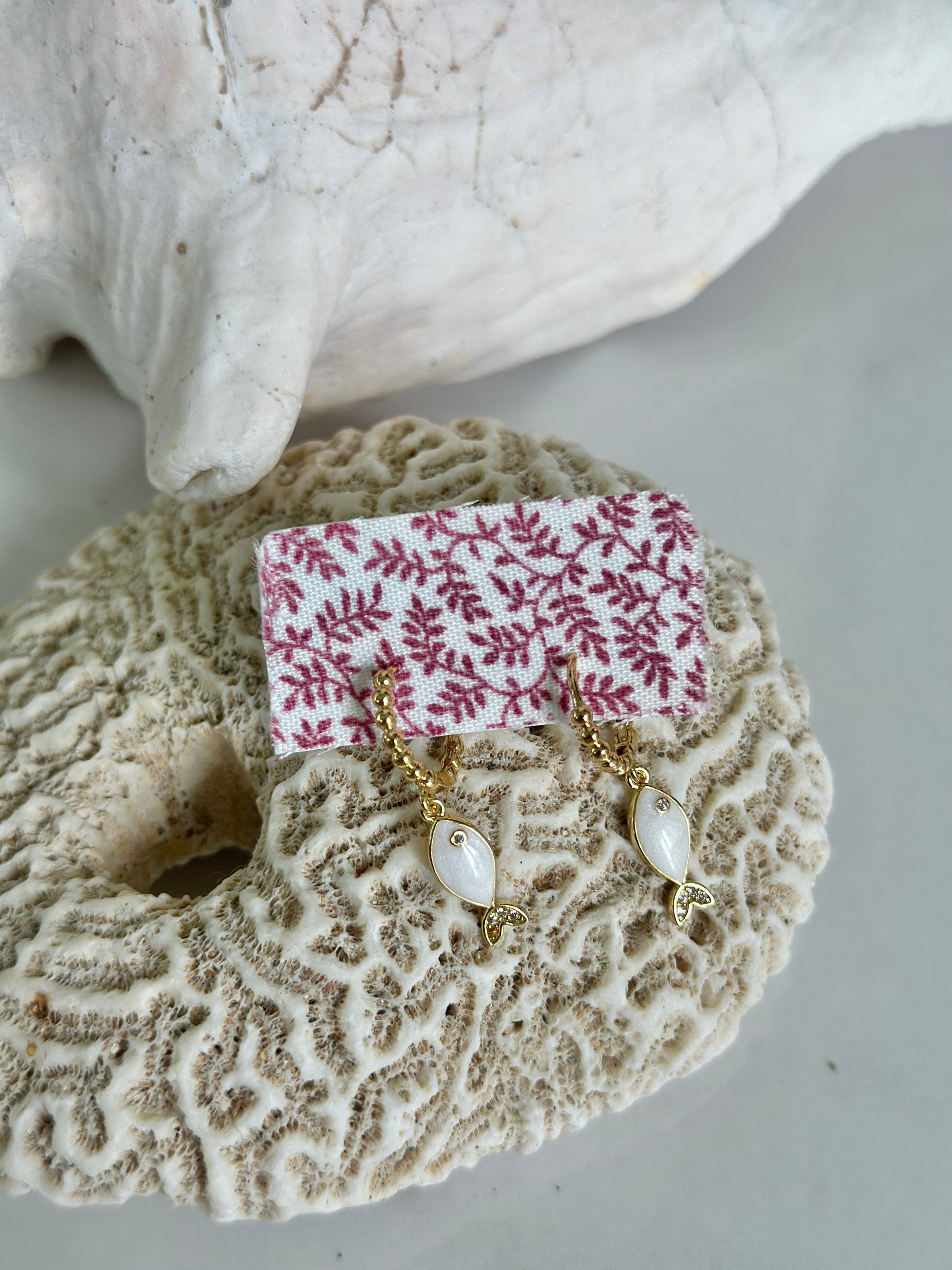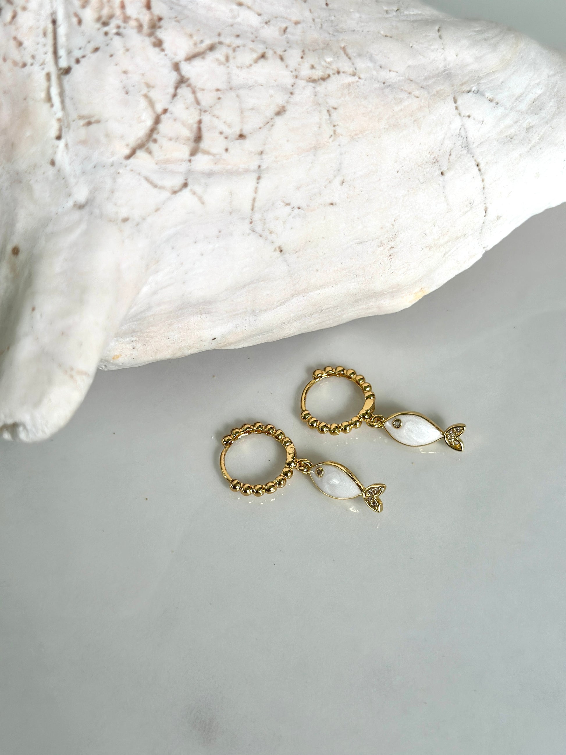Dainty and full of coastal charm — the Seaside Fish Hoops feature petite white enamel fish charms suspended from textured gold beaded hoops. Each piece captures the light beautifully, adding an easy touch of by-the-water polish to your everyday look.