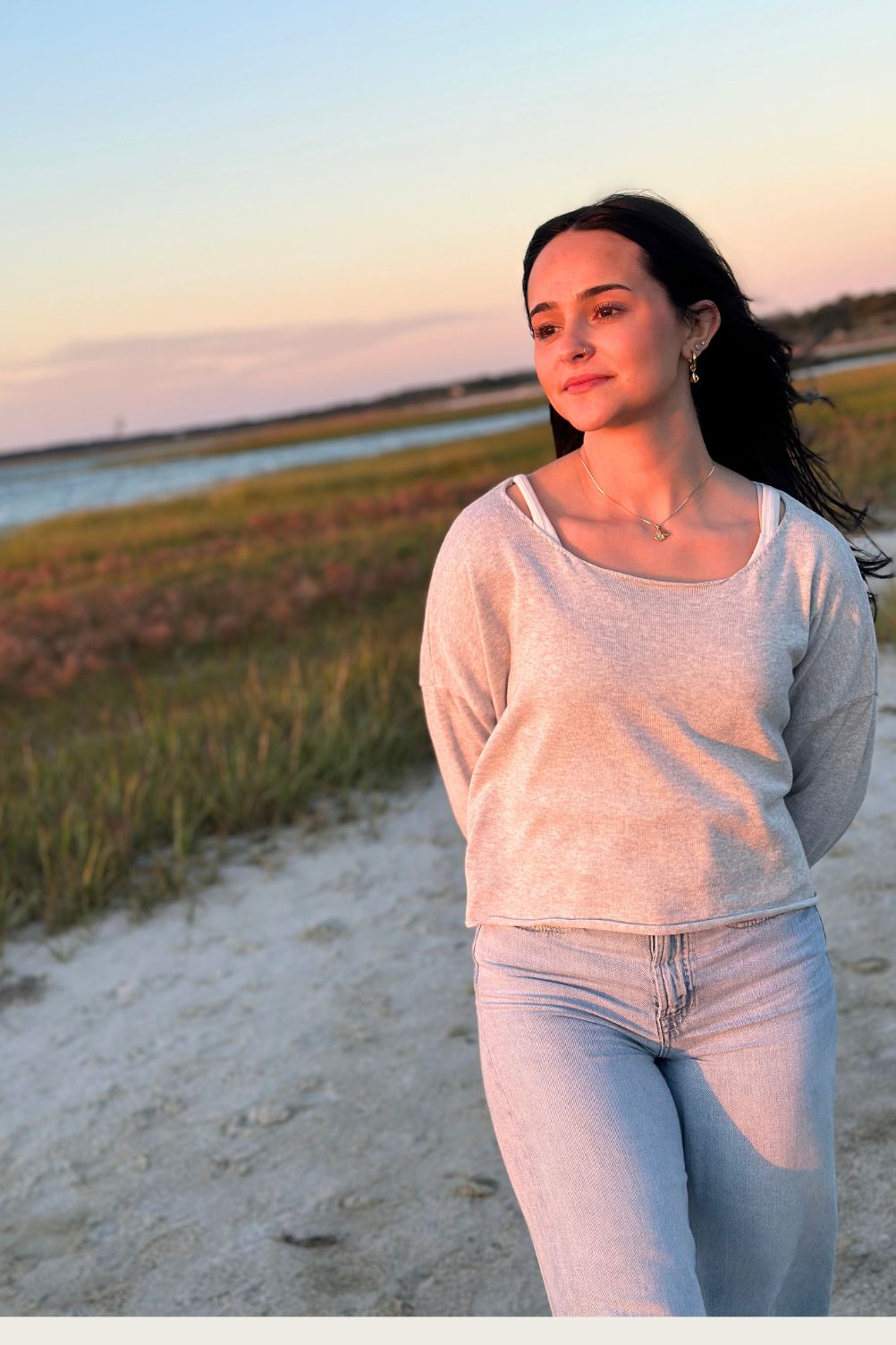 The perfect lightweight layer for any occasion. It features a wide boatneck and a cropped fit. Available in grey and cream, these are the perfect closet staple.
